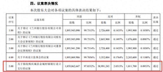 近期中国股票网,兰州银行发布2025年第一次临时股东大会决议公告,会议以特别决议审议通过了多项议案,其中包括关于拟收购庆城县金城村镇银行设立支行的议案。