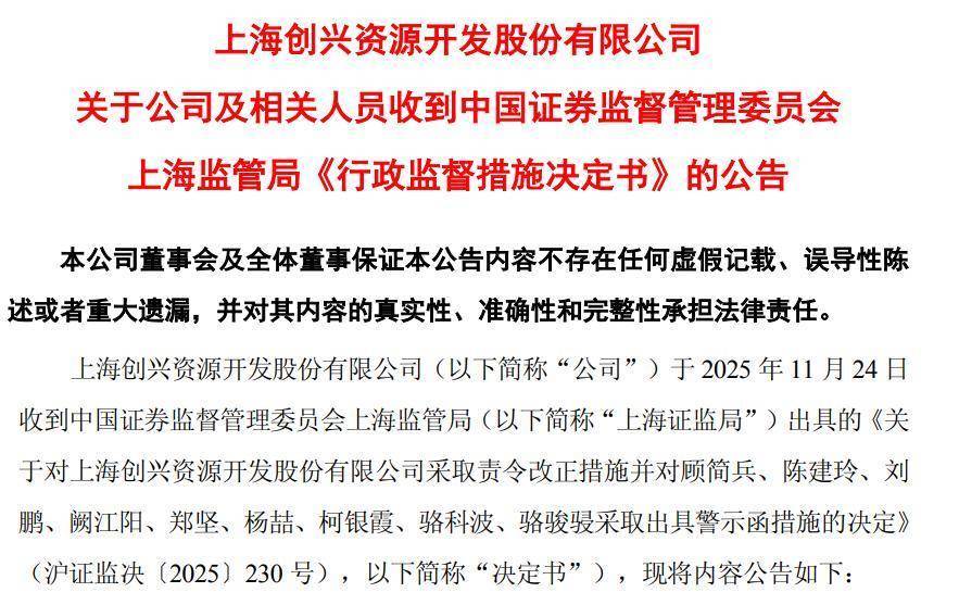 11月24日晚间南昌股票配资,*ST创兴(600193)公告,公司于2025年11月24日收到上海证监局出具的《关于对上海创兴资源开发股份有限公司采取责令改正措施并对顾简兵、陈建玲、刘鹏、阙江阳、郑坚、杨喆、柯银霞、骆科波、骆骏骎采取出具警示函措施的决定》(以下简称《决定》)。