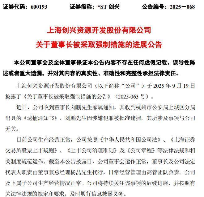值得注意是,不久前,公司董事长刘鹏因涉嫌犯罪被批捕。10月30日晚间,*ST创兴公告,近日公司收到董事长刘鹏家属通知,其收到杭州市公安局上城区分局出具的《逮捕通知书》,刘鹏因涉嫌犯罪被批准逮捕。其所涉及事项与公司无关。
